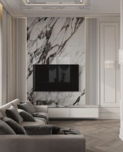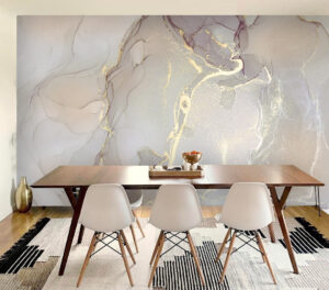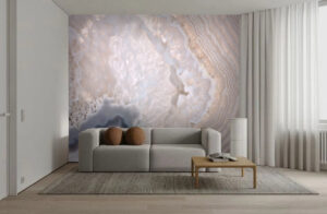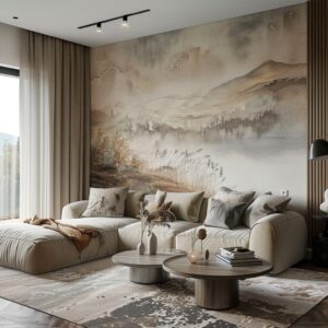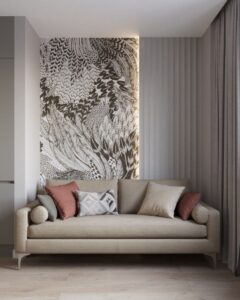 - Гостиная: Смелые решения, акцент на целой стене за диваном или ТВ. Пейзажи, абстракция, геометрия, имитация камня.