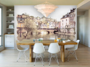 - Кухня: Избегайте изображений еды в больших количествах. Подойдут кофейные/городские темы, зелень, абстракция, классические сюжетные фрески.