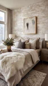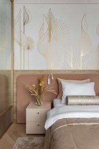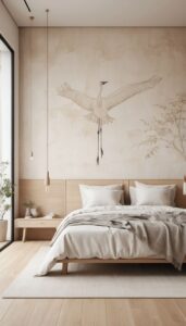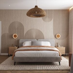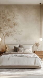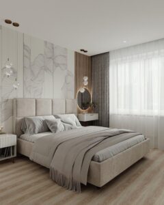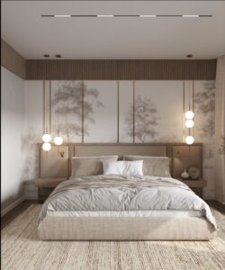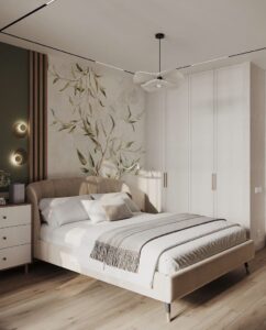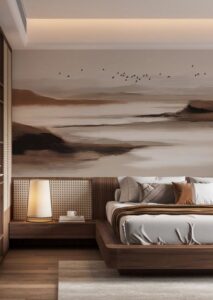 - Спальня: Акцентная стена у изголовья кровати с изображением туманного леса или текстурой состаренного дерева. Способствует глубокому отдыху.
