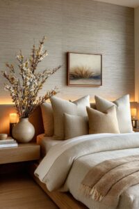 - Сдержанная цветовая палитра: Основа — нейтральные тона (бежевый, серый, белый, кремовый), акценты — приглушенные цвета природы (цвет мха, коры, глины, индиго).