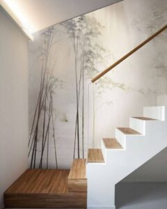 - Гостиная: Стена за диваном с панорамным пейзажем или графичным бамбуком. Создает фокусную точку для спокойного общения.
